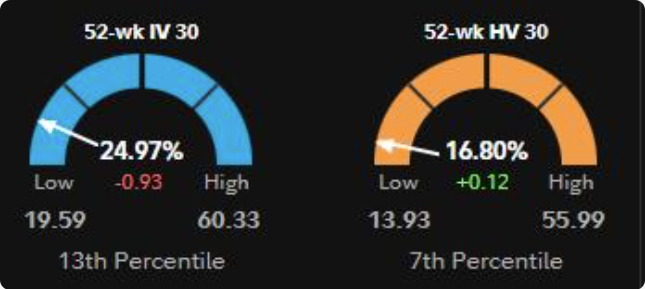 Fidelity Trader+TM Web offers a tool under Option Statistics that you can use to determine if volatility is higher or lower than normal. The same information can also be found on Fidelity's Key Statistics (provided by LIVEVOL, Inc.). In the example below, the 52-week range for 30-day implied volatility on the left was 19.59 to 60.33. This tells you the highest and lowest implied volatility levels for a hypothetical 30-day option over the last 52 weeks, with the current implied volatility level (24.97%) and where it ranks in percentile format. The percentile ranges from 0–100 so a 13% reading implies a relatively low implied volatility environment.