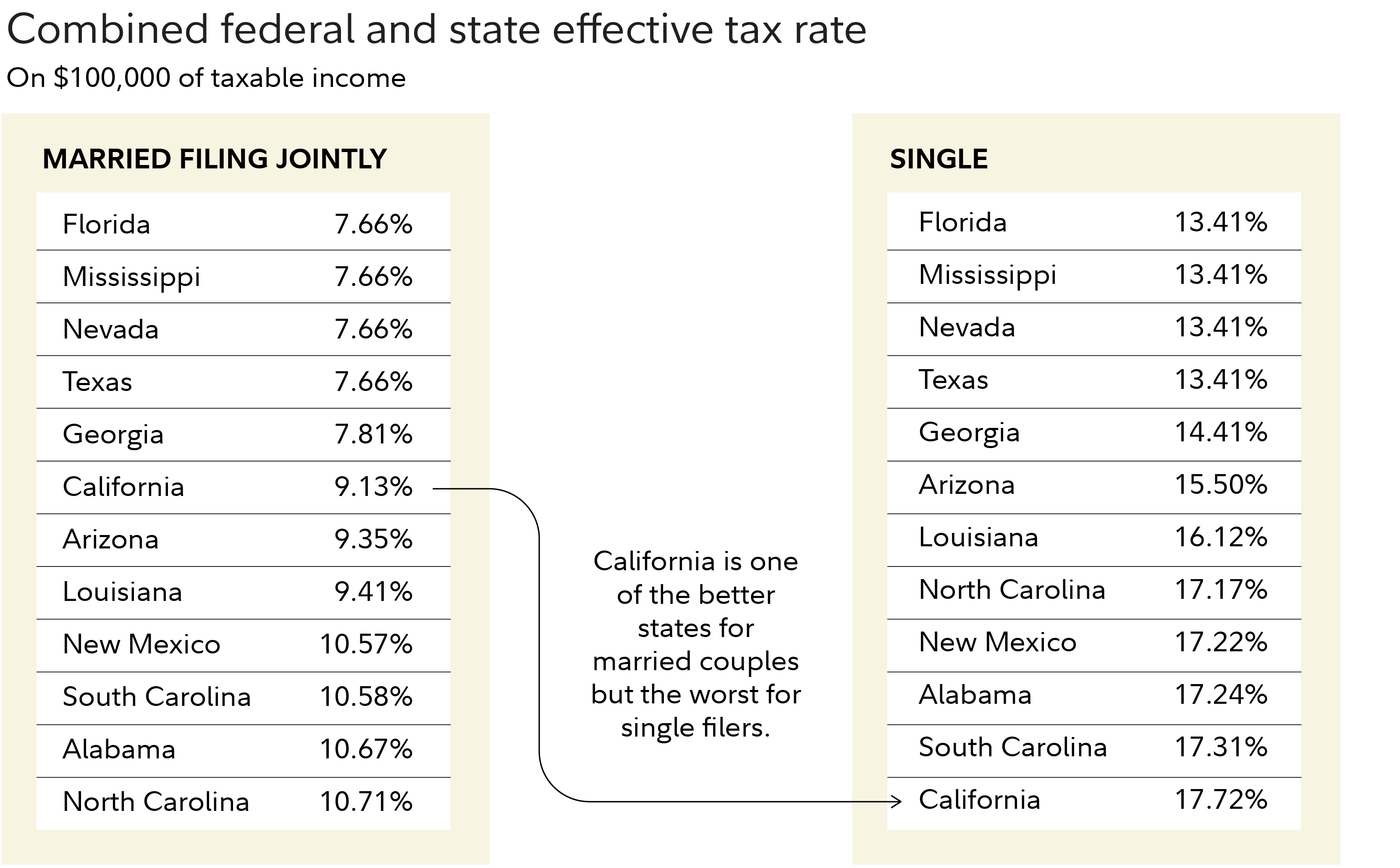 Nevada, Texas, and Florida are at the low end for both married and single filers; that’s because they have no state income tax. But the gap between states with income tax and those without may be narrower than you might expect when focusing on top marginal tax rates.