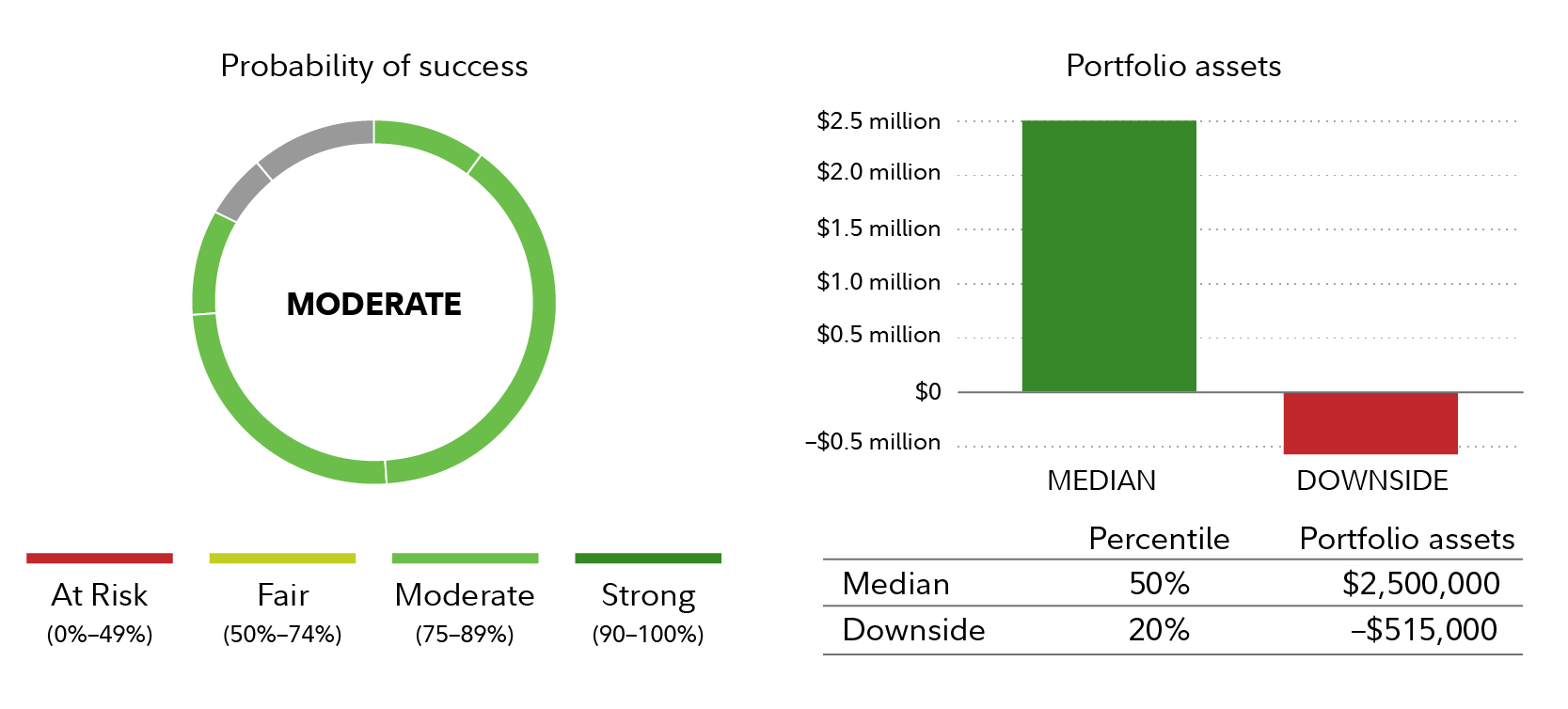 The illustrations show that if Frank and Julie stay on their current track, their savings have a "moderate" probability of lasting until the couple reaches age 96—meaning that in 75% to 89% of the simulations, their savings appeared to let them maintain their lifestyle in retirement.2 In an average market, the couple might reach age 96 with about $3.9 million left in their portfolio. In a very difficult market, defined in this case as the worst 2.5% of hypothetical market scenarios, they would likely fall short by about $970,000.
