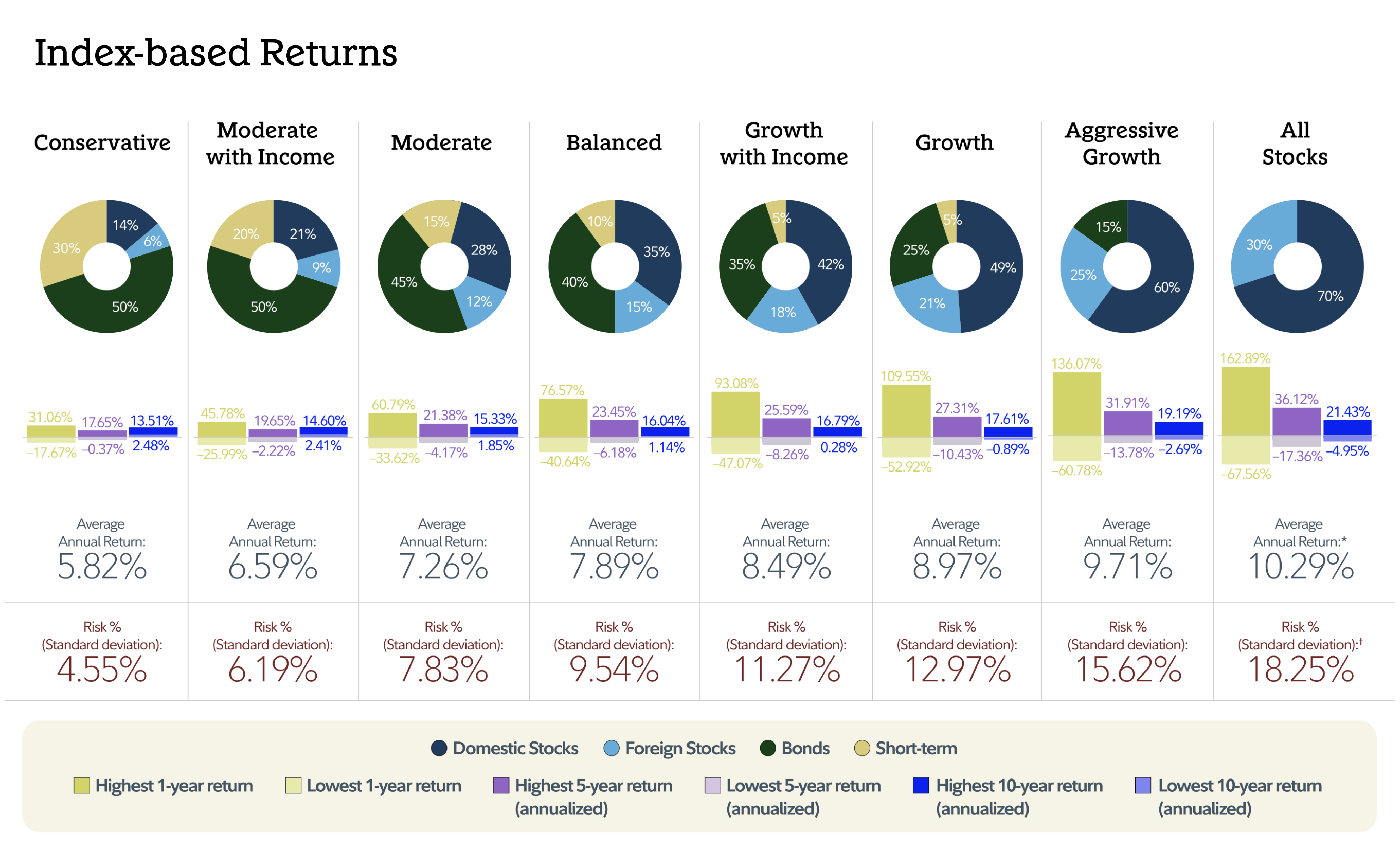 Source: Fidelity. The purpose of the target asset mixes is to show how target asset mixes may be created with different risk and return characteristics to help meet an investor’s goals. You should choose your own investments based on your particular objectives and situation. Be sure to review your decisions periodically to make sure they are still consistent with your goals.2