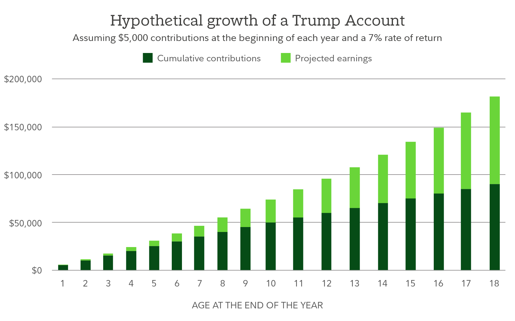This hypothetical example assumes the following: (1) annual contributions of $5,000 on January 1 of each year for ages 1 through 18, with no withdrawals through age 18, (2) an annual nominal rate of return of 7%, and (3) no taxes on any earnings within the account. The ending values do not reflect taxes, fees, or inflation. If they did, amounts would be lower. Earnings and pre-tax contributions from Trump Accounts are subject to taxes when withdrawn. Distributions before age 59½ may also be subject to a 10% penalty. Systematic investing does not ensure a profit and does not protect against loss in a declining market.