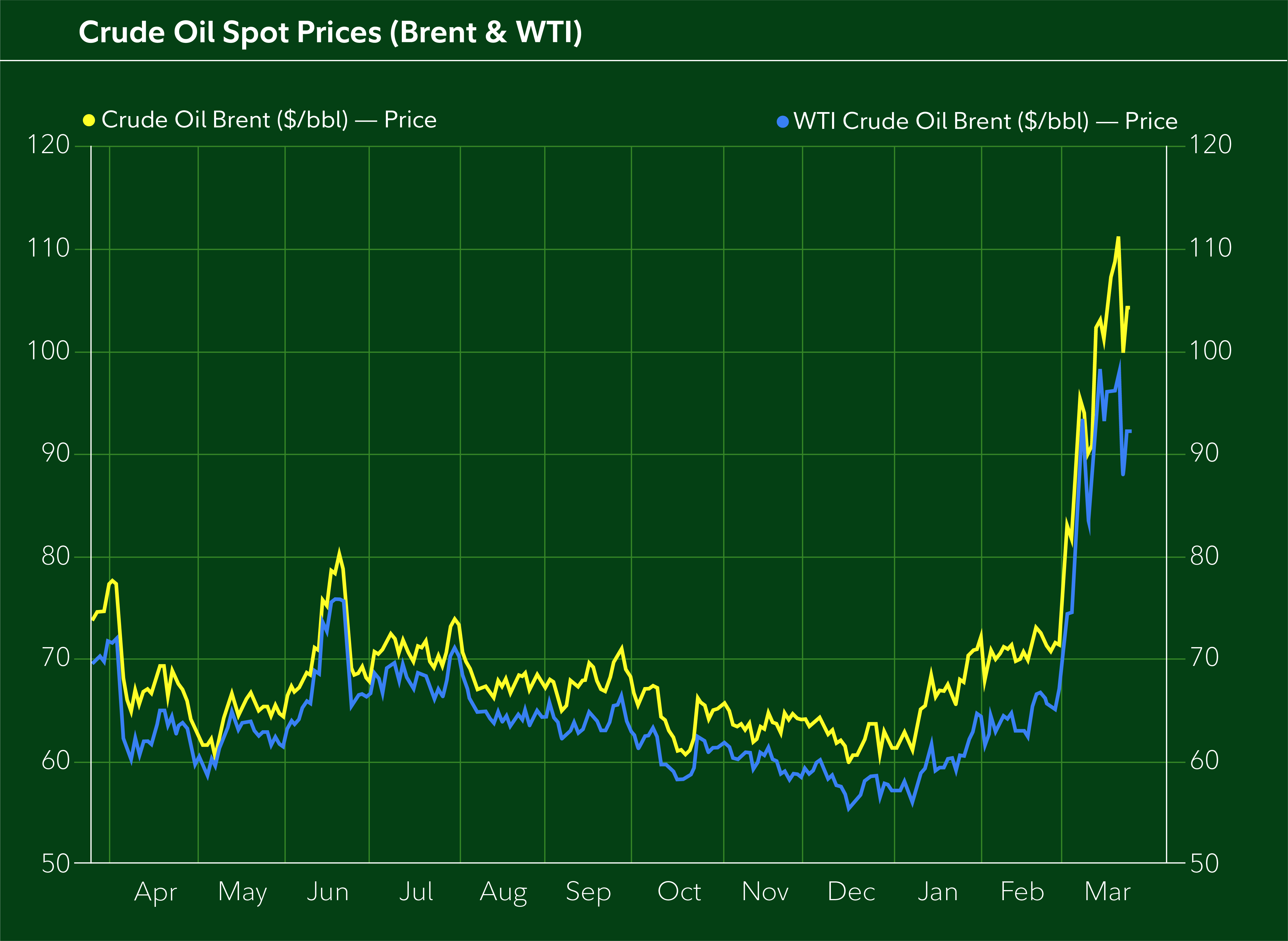 No part of the market has been more directly impacted by events in the Middle East than oil prices. At the start of 2026, West Texas Intermediate Crude—which is a light, sweet crude primarily produced in the United States and is used as the crude benchmark in the Americas, traded near $57 per barrel. It has since reached as high as over $98. Brent Crude, which is transported from the North Sea and is widely used as the global benchmark for oil pricing, has surpassed $110 per barrel at its highest point this year.