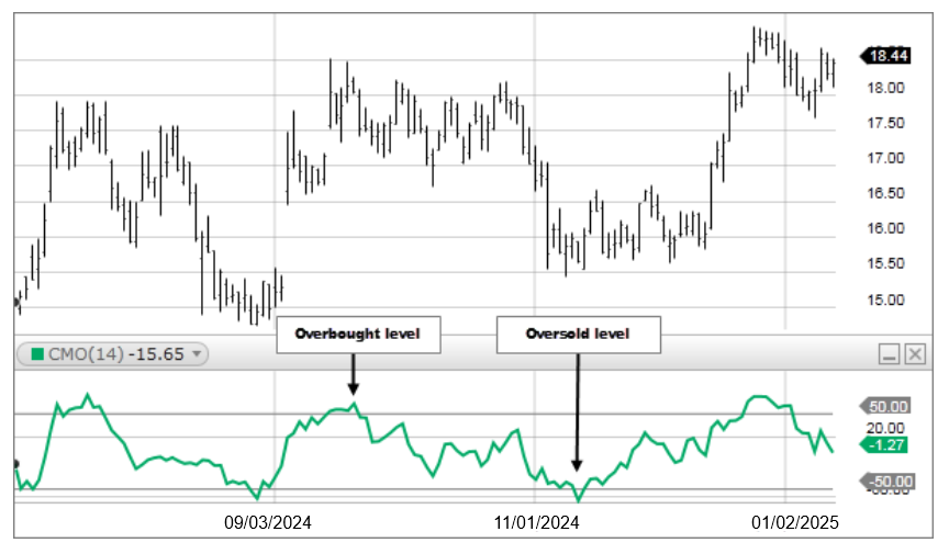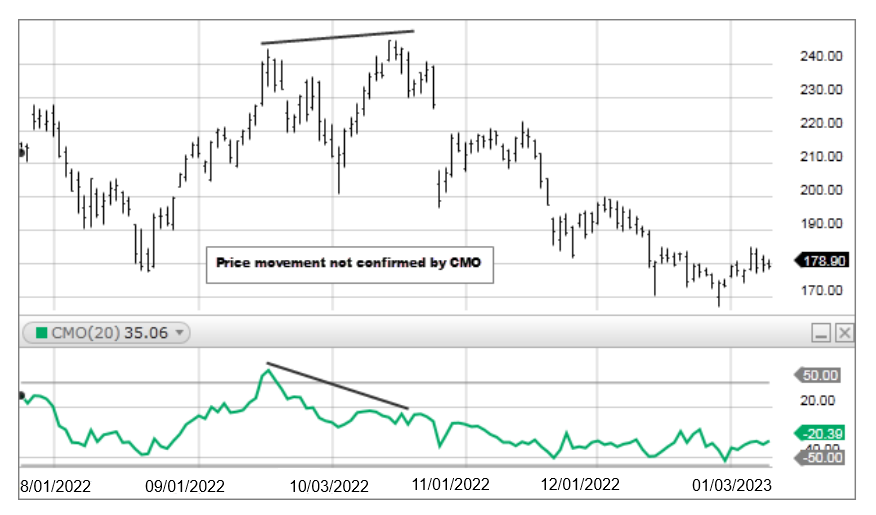 - If underlying prices make a new high or low that is not confirmed by the CMO, the divergence can signal a price reversal.