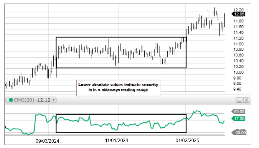 - CMO measures the trend strength. The higher the absolute value of the CMO, the stronger the trend. Lower absolute values of the CMO indicate sideways trading ranges.