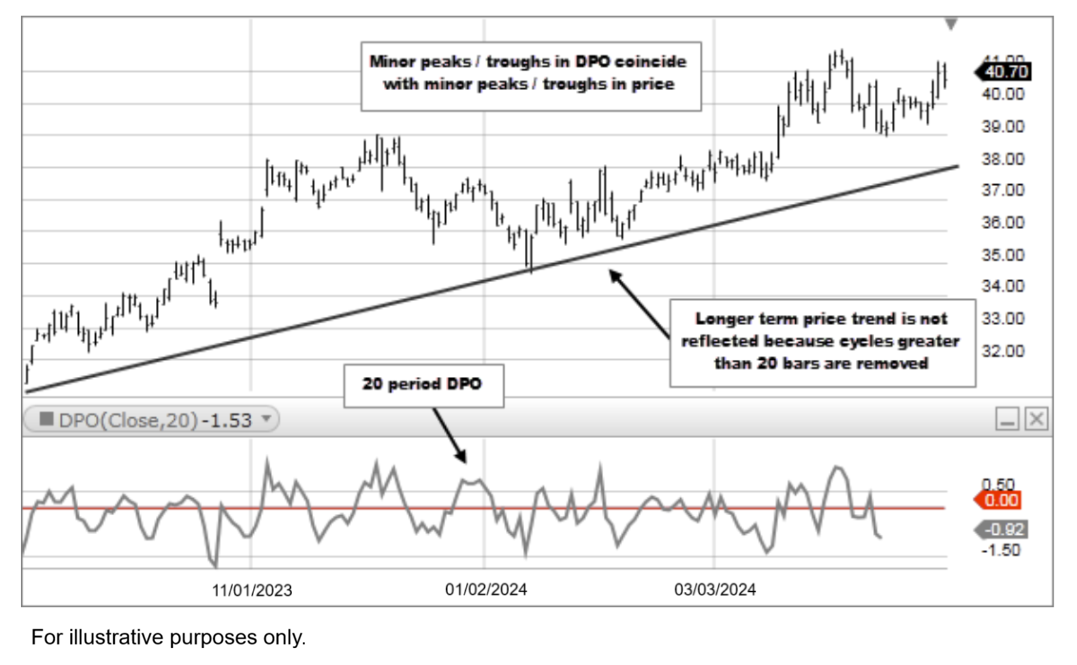 The Detrended Price Oscillator attempts to remove trend from price in order to allow identification of cycles more easily. Cycles longer than the period specified for the indicator are removed, leaving only the shorter-term cycles. DPO is displaced to the left so that the indicator is aligned with the peaks and troughs in price.