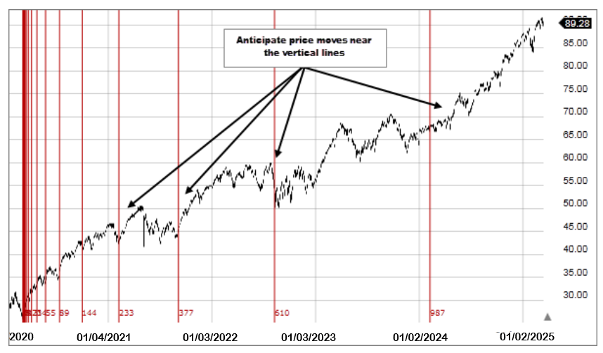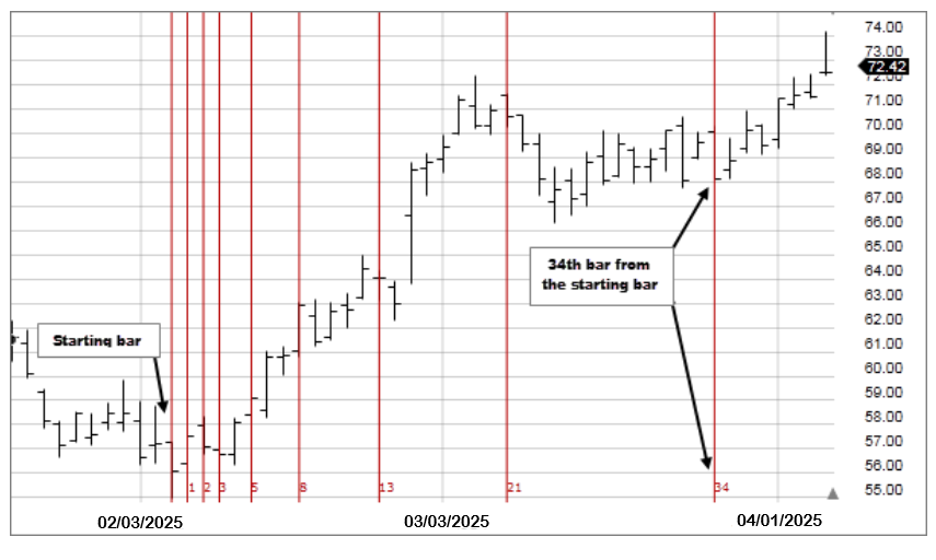Vertical lines are drawn at Fibonacci intervals starting from the bar selected with the drawing tool.