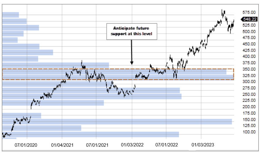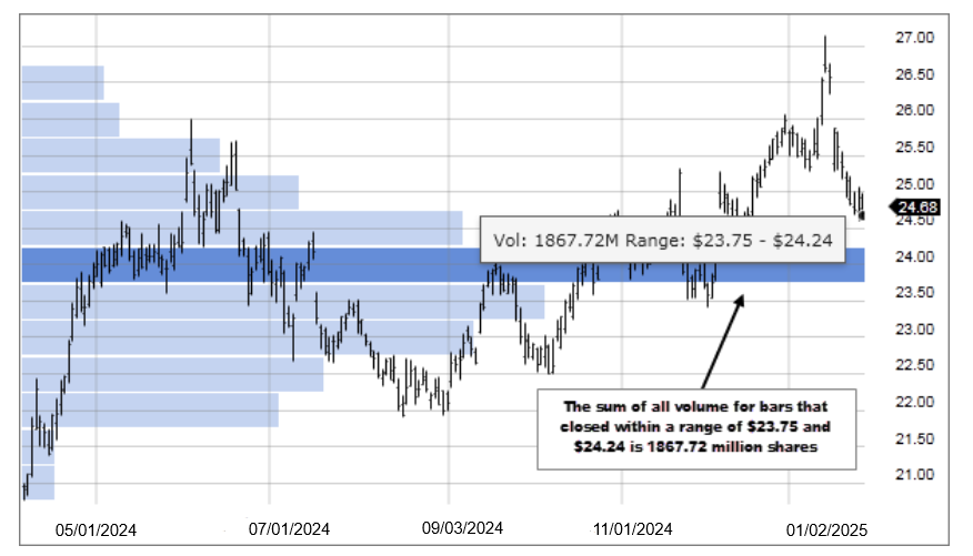 - Price ranges with heavier volume indicate more interest at those price levels. Longer horizontal bars should be monitored for possible future support/resistance