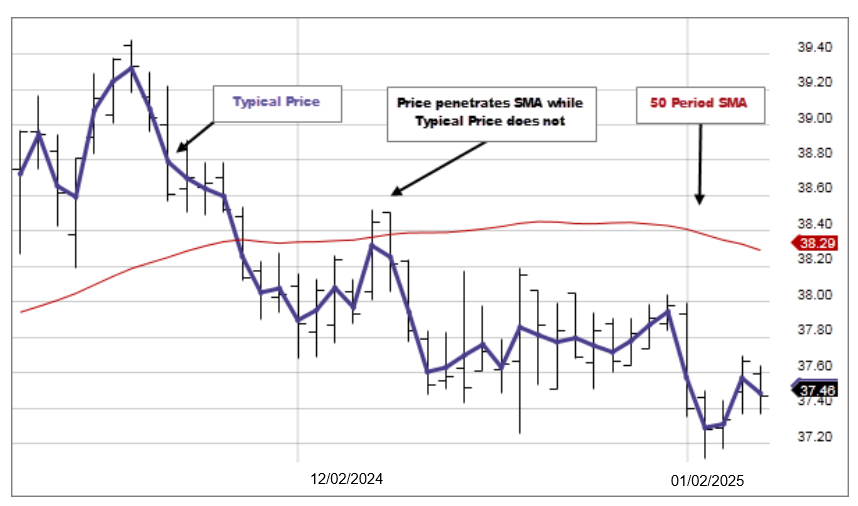 The Typical Price indicator provides a simple, single-line plot of the day’s average price. Some investors use the Typical Price rather than the closing price when creating moving-average penetration systems.