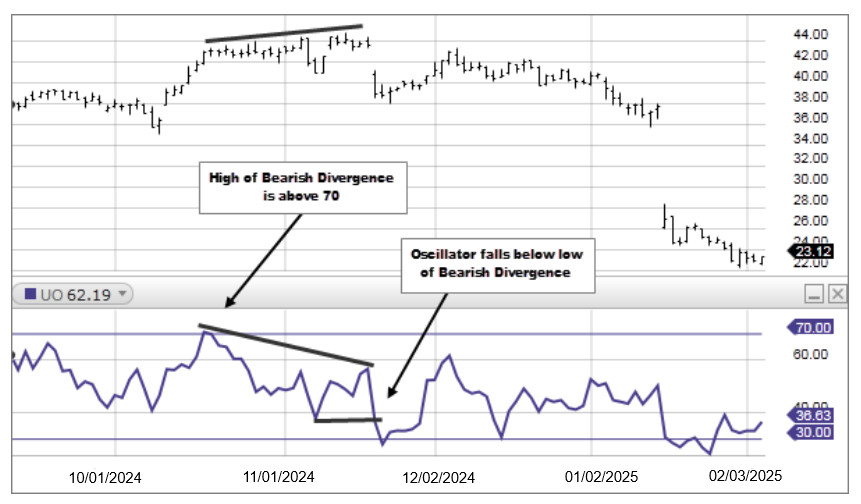 - A bearish divergence occurs. This is when the security's price makes a higher high that is not confirmed by a higher high in the Oscillator.