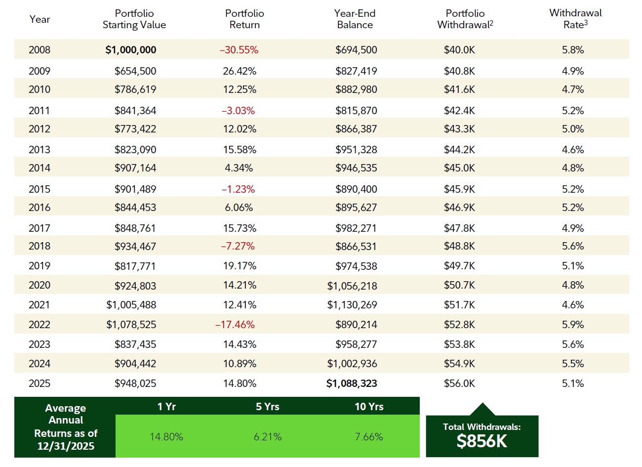 For our fictional couple, this meant that over the period between 2008 and 2025, they would have been able to stick to their withdrawal strategy and get the funds they needed to live the lifestyle they wanted even when markets were down. In fact, by the end of that period, they would have withdrawn $856,000 and still ended up with a portfolio value almost $1.1 million.