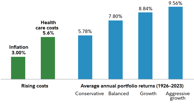 This graph is for illustrative purposes only and does not represent actual or implied performance of any investment option. Data for health care costs is from the Centers for Medicare and Medicaid Services, National Health Expenditures Estimates 2023–2032. All indices are unmanaged, and it is not possible to invest directly in an index. Past performance is no guarantee of future results. Returns include the reinvestment of dividends and other earnings. Data source: Morningstar Inc., 2024 (1926–2023 ). Domestic stocks are represented by the S&P 500® index, bonds are represented by U.S. Intermediate Government Bond Index, and short-term assets are based on the 30-day U.S. Treasury bill. Foreign equities are represented by the MSCI Europe, Australasia, and Far East Index for the period from 1970 to the last calendar year. Foreign equities prior to 1970 are represented by the S&P 500 ® index. Inflation is represented by the Consumer Price Index. U.S. stock prices are more volatile than those of other securities. Government bonds and corporate bonds have more moderate short-term price fluctuation than stocks but provide lower potential long-term returns. U.S. Treasury bills maintain a stable value (if held to maturity), but returns are generally only slightly above the inflation rate. Asset allocation does not ensure a profit or protect against a loss.