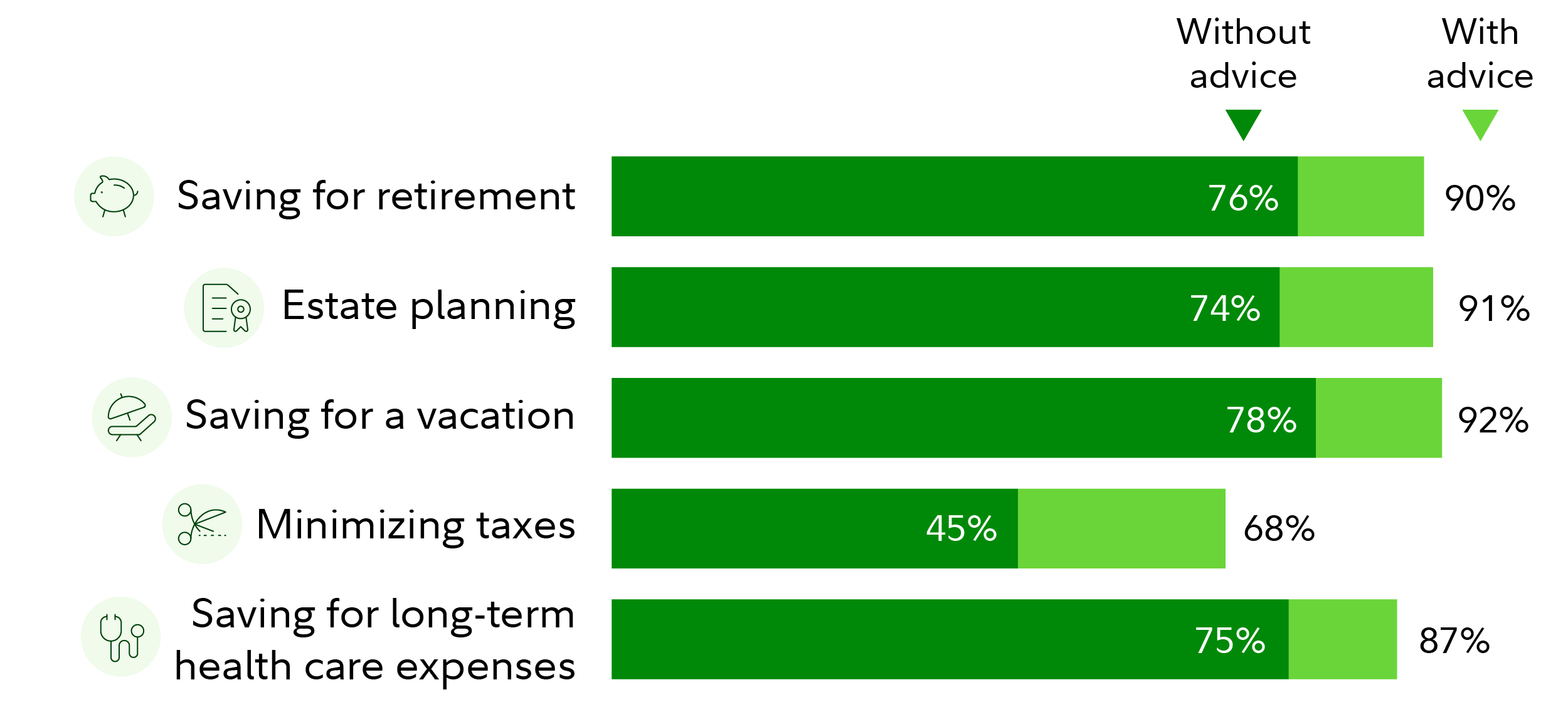 Everyone can benefit from working with a financial professional. And we mean everyone—no matter your situation. Those who work with a financial professional are generally more confident about their goals and about their overall financial situation.1 Additionally, industry studies estimate that professional financial advice and investment management can add up to 5.1% to portfolio returns over the long term (depending on the time period and how returns are calculated).2 Here’s a quick look at the percentage of investors who say they feel confident about reaching their goal with and without financial advice.