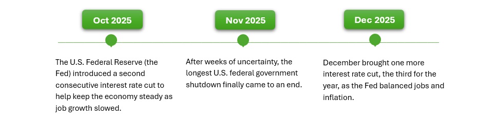Global financial markets continued to deliver solid gains in both the fourth quarter and across 2025. U.S. stock returns were mixed in the final months as investors weighed slowing job growth and persistent inflation against elevated valuations for some artificial intelligence (AI) companies. Earlier in the year, investor sentiment felt the strain caused by shifting tariff policies and concerns over the impact of a new tax bill signed in July. However, resilient economic growth, rising corporate earnings, and optimism around AI ultimately powered strong full year returns for U.S. stocks.1