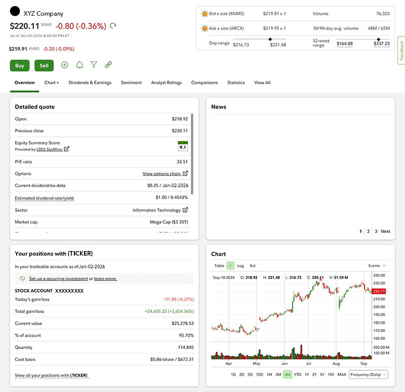 Suppose you were considering investing in a stock. On its snapshot page, you can find a detailed quote containing vital information such as the current stock price, average daily volume, and annual yield (see the example image below). You’ll also be able to look at a chart of the stock’s price, find the latest news and research reports, and see other key statistics.