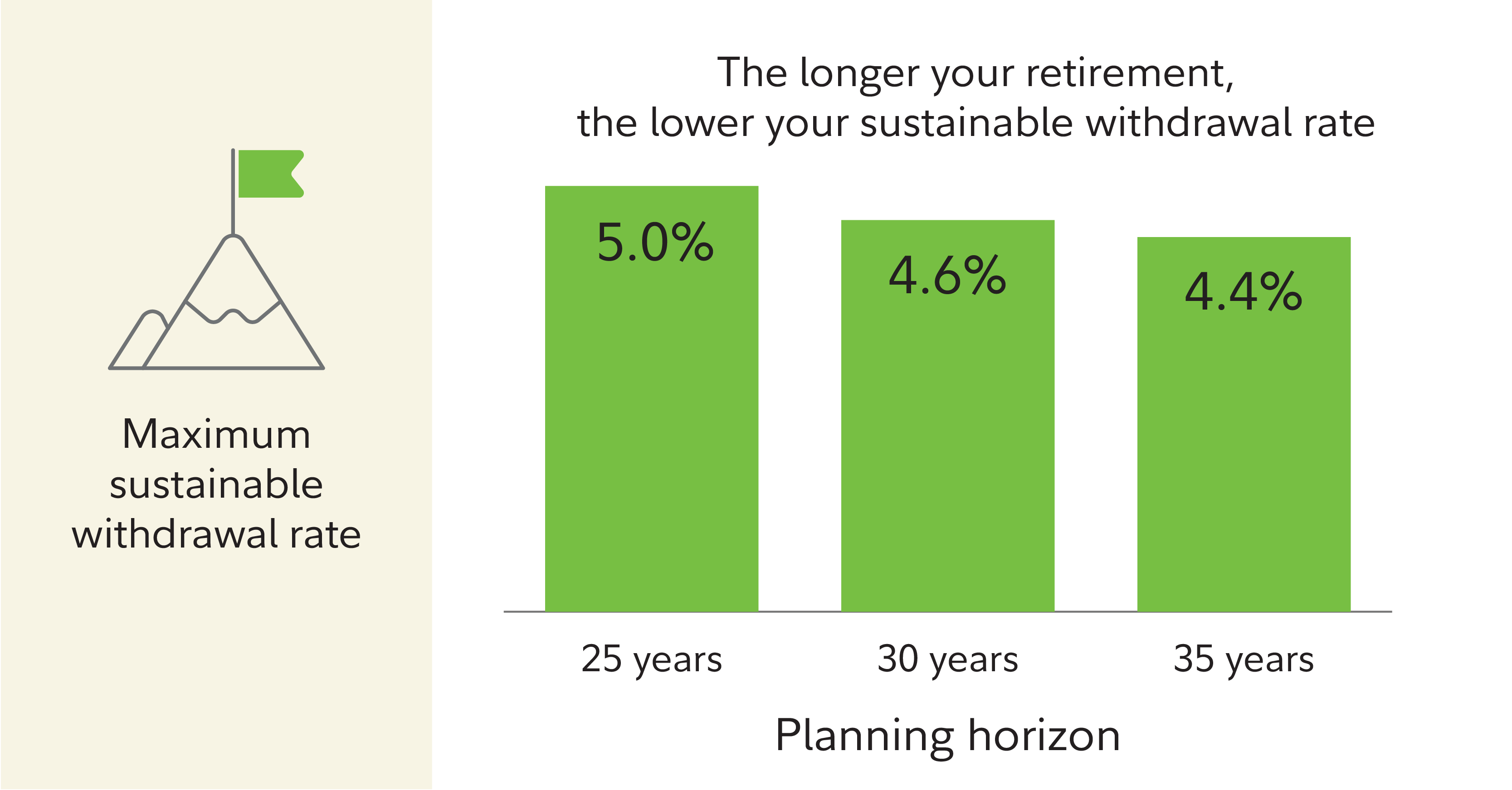 But if you work longer—say you expect to retire at age 70—or if you have health issues that compromise your life expectancy, you may want to plan on a shorter retirement period—say, 25 years. The historical analysis shows that, over a 25-year retirement period, a 5.0% withdrawal rate has worked 90% of the time.