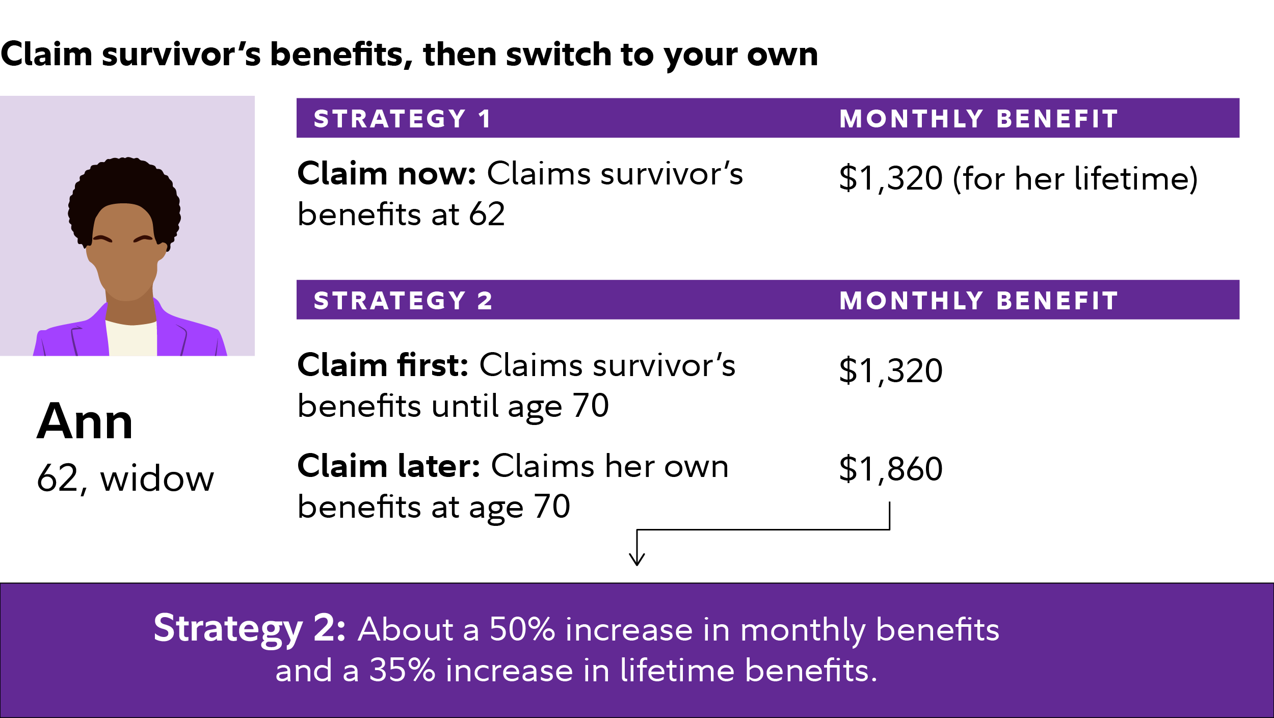 Consider this hypothetical example. Ann is eligible to receive $1,050 if she were to claim her own Social Security benefit at age 62. Her husband John had begun receiving his monthly benefits of $1,120 at age 62, but he died this year at age 66. If Ann claims her survivor's benefits now before her FRA, she would receive $1,320 per month, an amount higher than her own benefit of $1,050. If you are a surviving spouse, Social Security automatically defaults to the higher amount—in this case, her survivor's benefit. Alternatively, she can elect to receive survivor's benefits until age 70, and then switch to her own benefits. By then her own benefits would have increased to $1,860 a month, a 44% increase in monthly benefits. Ann would earn more than $123,000 in extra payments if she lived to age 89, boosting her lifetime benefits by about 29%.2 These rules are complex, however, and you should consider speaking with a Social Security representative.