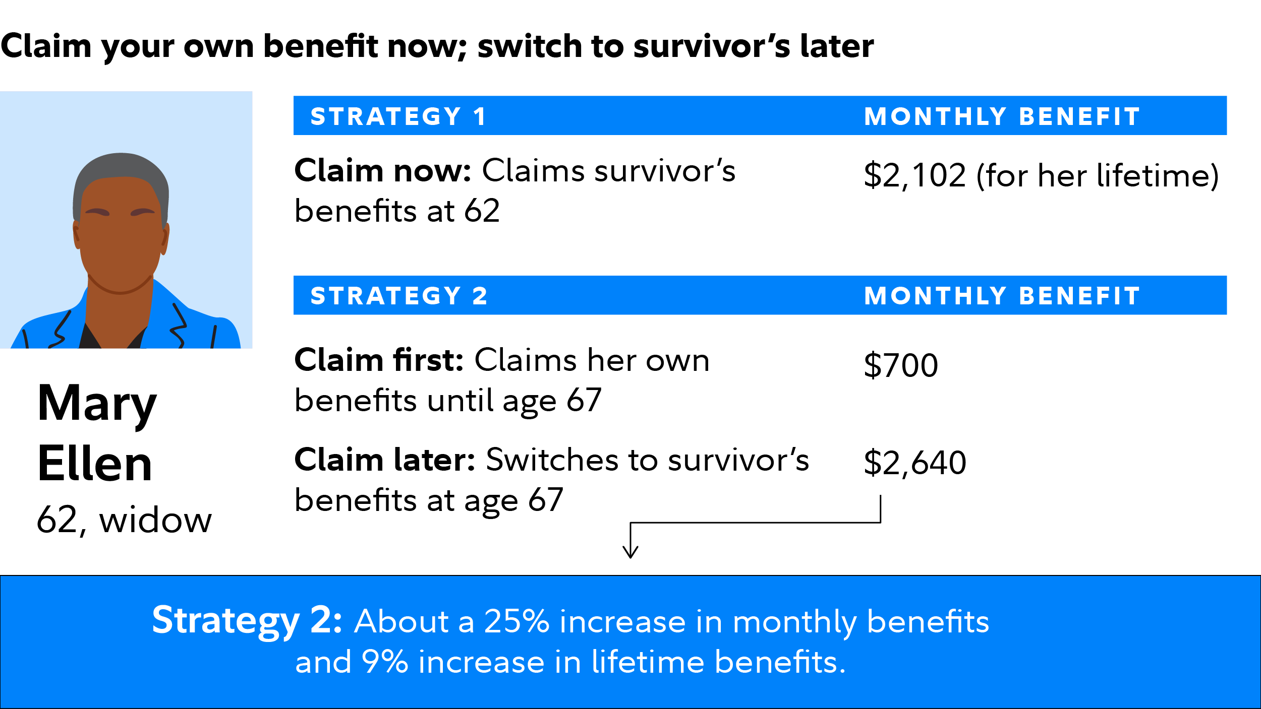 For example, Mary Ellen is eligible for $700 a month in benefits if she claims her own benefit at age 62 and $1,000 a month at her FRA. Her husband, Patrick, died this year. As in the previous example, if Mary Ellen claims survivor's benefits at 62 (before her survivor's FRA), she would receive $2,102 a month. If you are a surviving spouse, Social Security automatically defaults to the higher amount—your own or your survivor's benefit. But if Mary Ellen chooses her own lower benefits of $700 for the first 5 years of her retirement, by the time she hits FRA of 67, her survivor's benefit will rise to $2,640 a month, about a 26% increase. She could then switch to that higher amount, and increase her lifetime benefits by about $58,000, or 9%, if she lives to age 89.2